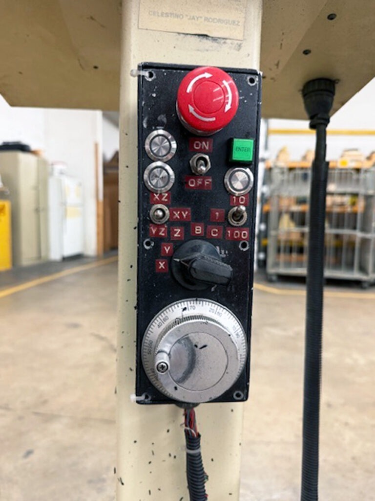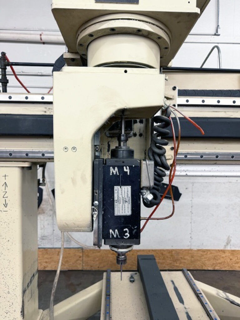 Used Motionmaster 5-axis CNC router, 5×5 moving table, 30 in. stroke, 7 hp collet spindle, Fagor 8050, remote. #E828