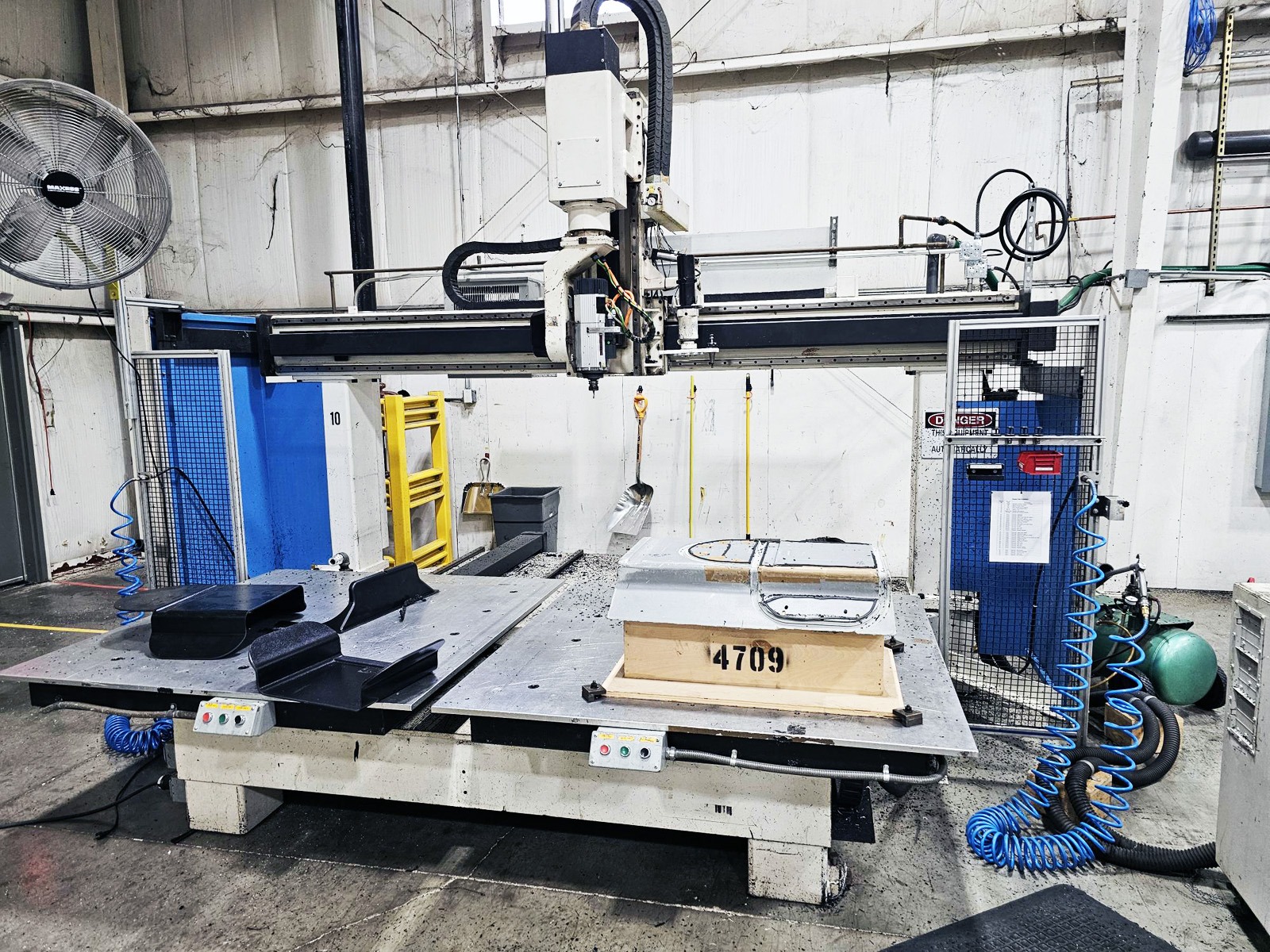 SOLD: Used Motionmaster 5 axis CNC router, equipped with twin 5 ft. x 5 ft. moving tables, 36 inches of Z axis stroke, a 10 hp HSD ATC spindle motor, and 6 position tool change carousel. The used CNC router machinery is controlled by a Fagor Automation 8055 Power CNC system controller.