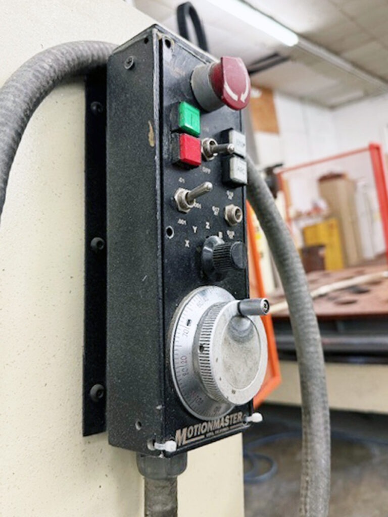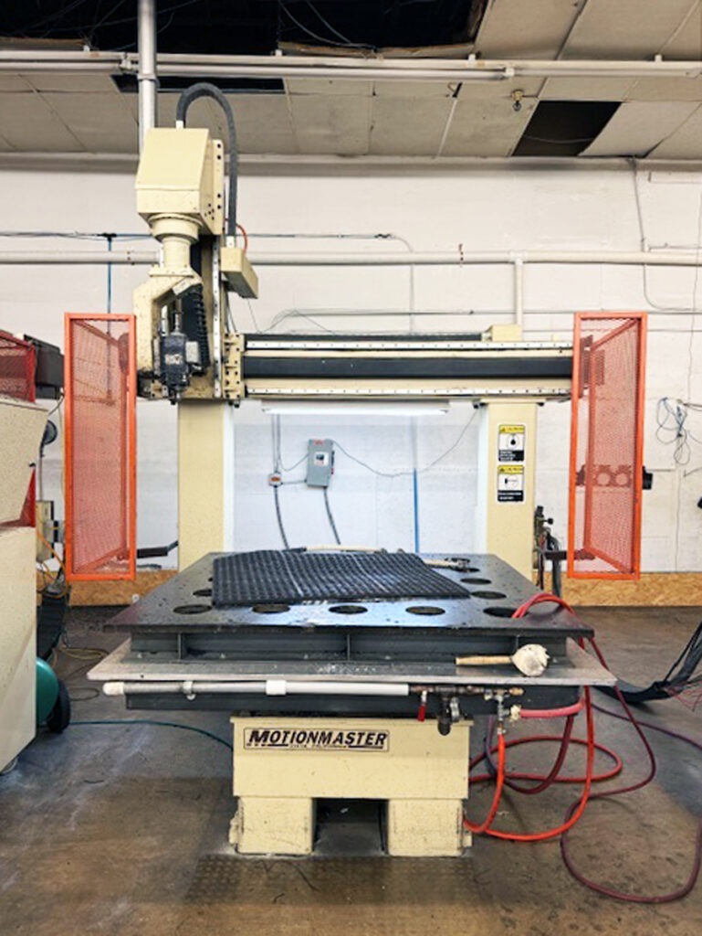 Used Motionmaster 5 axis CNC router for sale #E827 features a stationary bridge gantry, 5 ft. by 5 ft. moving router table and a 7 hp dual-ended manual tool change spindle motor. CNC machinery is controlled by a Fagor Automation 8055 CNC system. See more details below and contact us today for a quote.