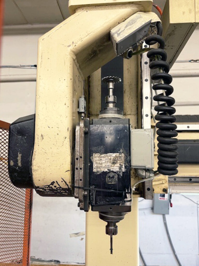 Used Motionmaster 5-axis CNC router, 5×5 moving table, 36 in. stroke, 7 hp dual-ended MTC spindle, Fagor 8055, remote. #E827