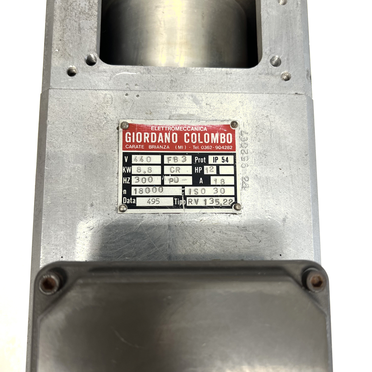 824-135-V103 Giordano Colombo spindle motor, model RV135/22 50 FP1 SB CPE 40 DX, 12 hp, 220/380 V, 36.5/21 A, 18,000 RPM, 300 Hz, 2 Pole. Used condition.