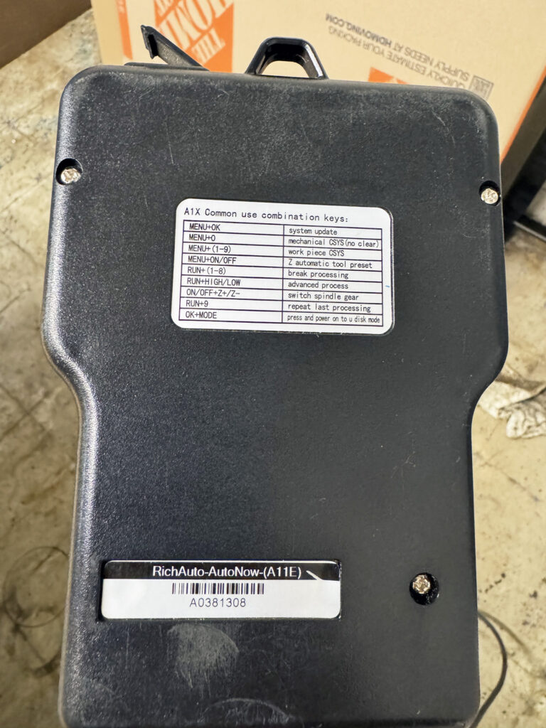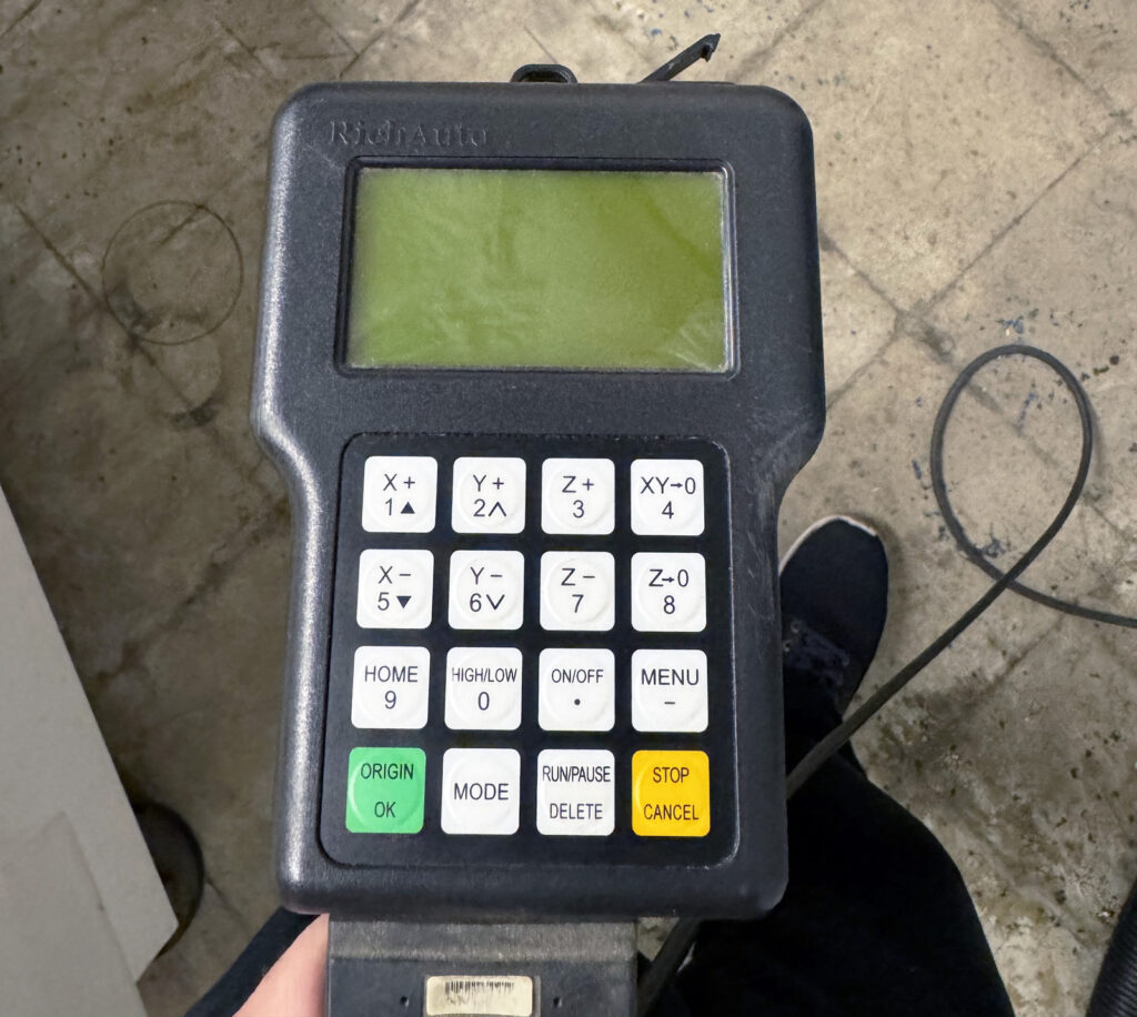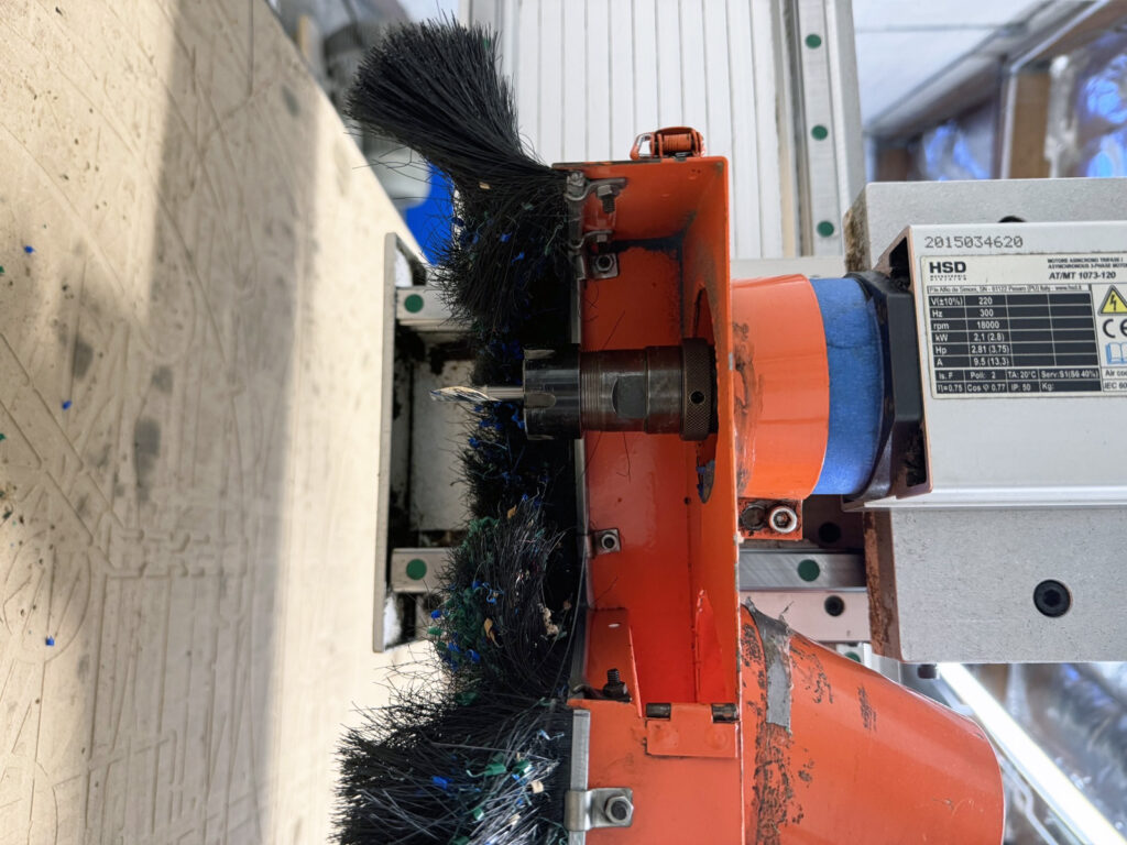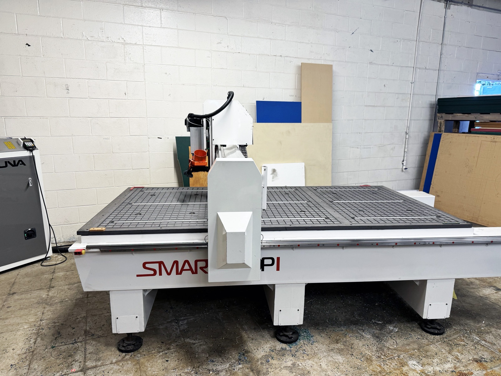 SOLD: Used 2015 Laguna Smart Shop 3 axis CNC router, equipped with stationary 4ft. x 8ft. router table, moving gantry, 9 inches of Z axis stroke, a 2.8 hp HSD spindle motor, and dust collection hood. This used CNC router machinery is controlled by a Handheld RichAuto A1 X CNC.