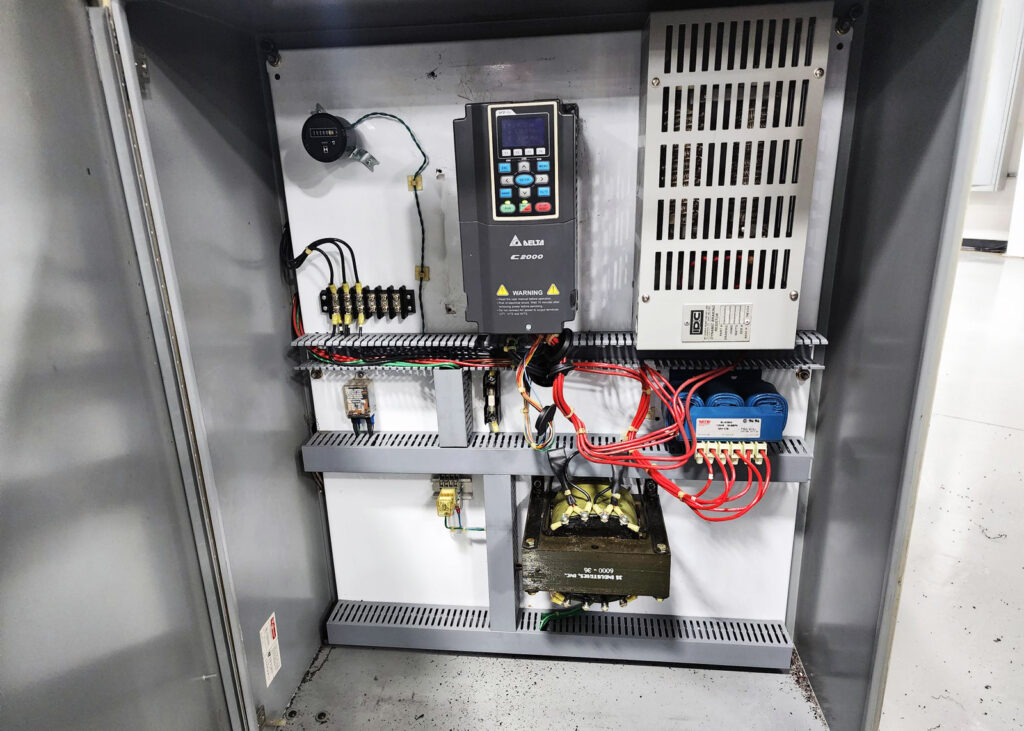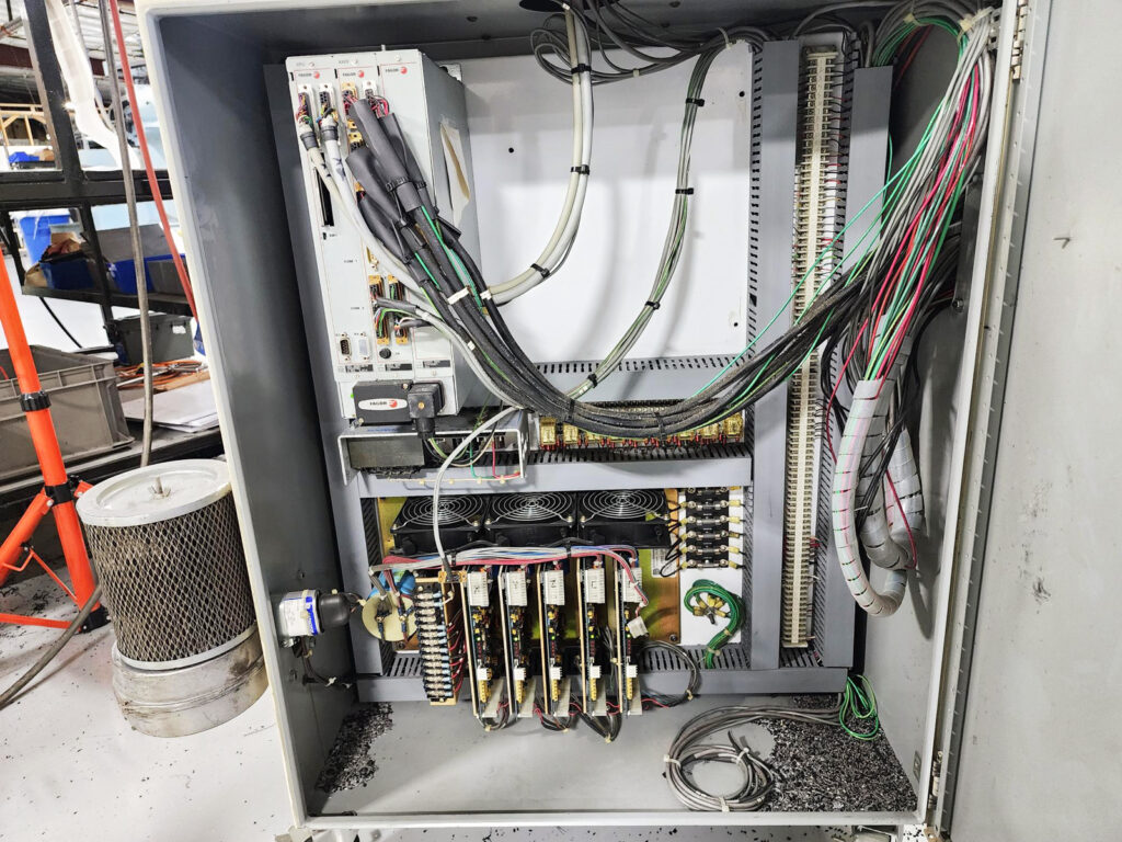SOLD: Used Motionmaster 5 axis CNC router, 5 ft. x 5 ft. moving router table, 36 inches of Z-axis stroke, and a 7.5 hp Perske dual-ended spindle motor. CNC machinery is controlled by a Fagor 8055-B CNC system w/ teach pendant.